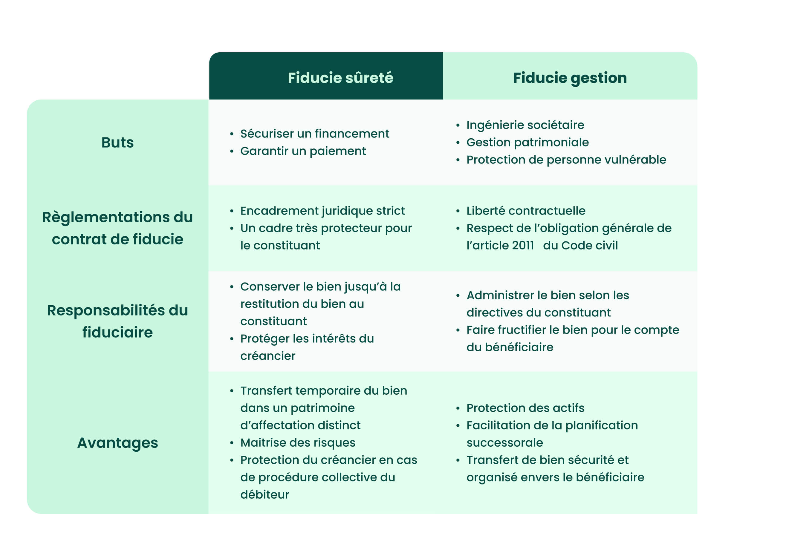 Bien qu'encadrée par le code civil, la fiducie gestion bénéficie d’un cadre réglementaire plus souple, répondant notamment aux exigences de l'article 2011 du Code civil. Les parties sont donc libres de déterminer contractuellement les modalités de l’opération de fiducie en fonction de la situation juridique. Mais le contrat de fiducie doit impérativement définir les pouvoirs d’administration du fiduciaire.