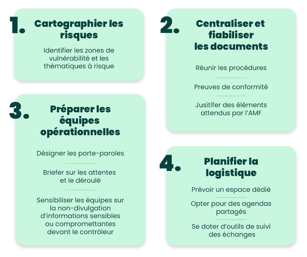 - Former ses équipes : acculturer aux attentes de l’AMF et au déroulement d’un contrôle.